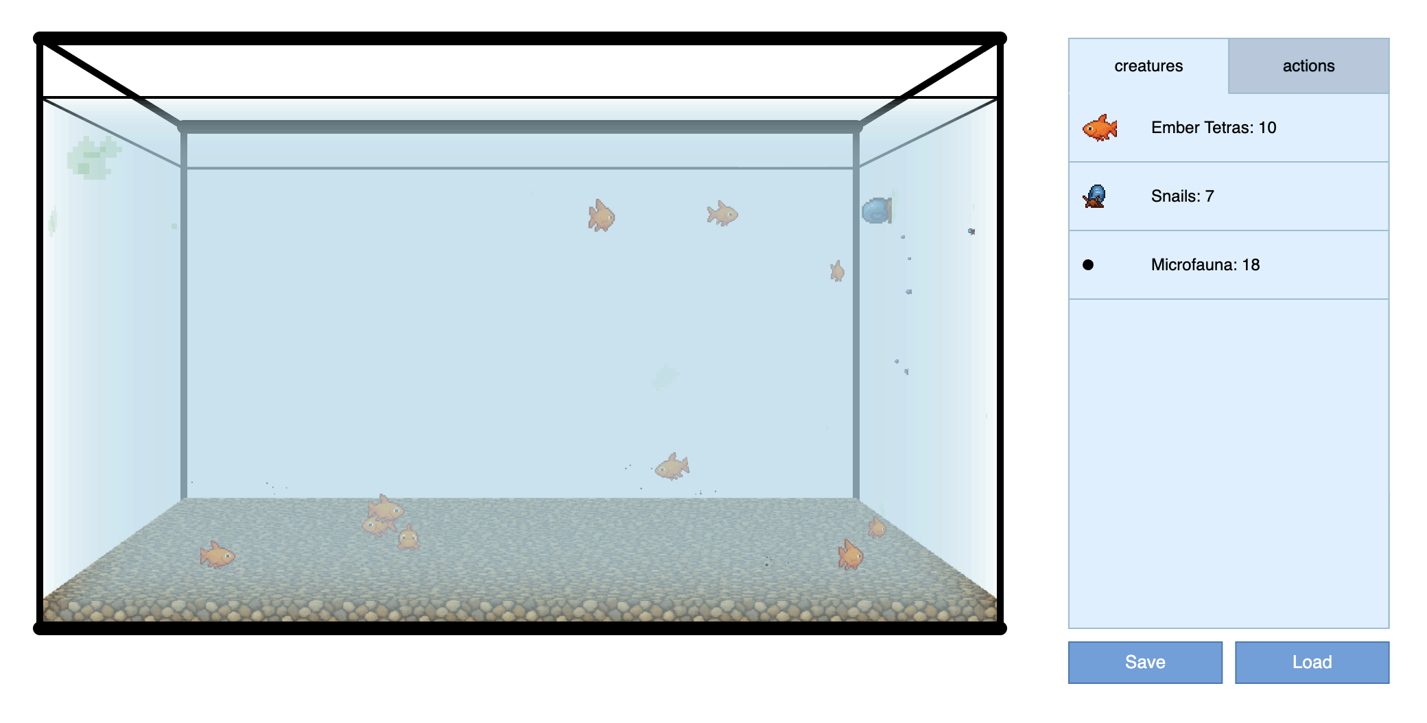 → Try it here ← This virtual aquarium is meant to simulate various aspects of my real aquarium I kept for a few years. My intention was to encode logic with relatively simple rules that with enough nesting would create realistic behavior and emergent complexity. As examples: Fish show loose shoaling behavior where if not actively foraging, they tend to follow the group, especially when individuals move quickly Overfeeding the aquarium causes snail populations to explode. Stopping overfeeding causes many of the snails to eventually die off, with empty shells gathering in the corners of the tank. See below for a more detailed system design and a description of future possible features. ...